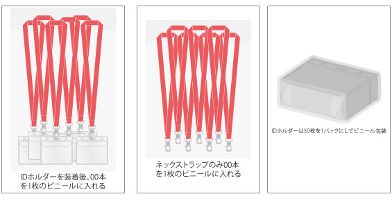 - 製品納品後、社内で配布するので、ネックストラップとIDケースを一緒にして、小さい袋に個別包装して欲しい。