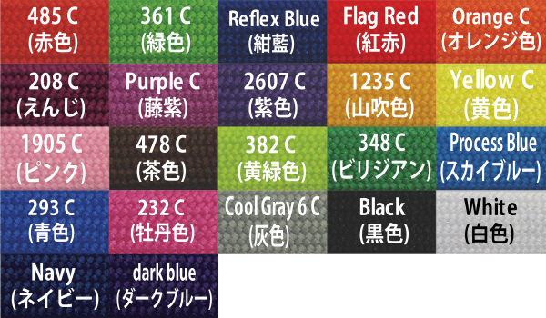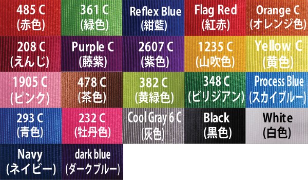 いづれも、ポリエステル素材を使用し、全22色から選択頂けます。いづれの色も、10mm幅、15mm幅、20mm幅で製作可能です。100本以上のご注文の場合、規定の22色以外の、お客様の指定する、特別な色でネックストラップ紐を染色することも可能です。詳しくは、特色染色をご覧ください。