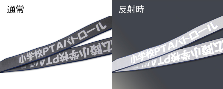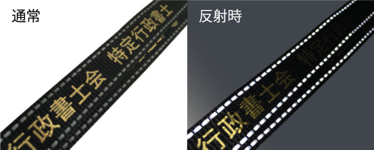 ネックストラップには通常のシルク印刷で、会社名やロゴの名入れを行い、ネックストラップ紐の両端にステッチ加工として、反射材を織り込む方法です。自動車のライト等に照射され、ネックストラップが反射した場合、ステッチ部分が反射され、安全性の向上につながります。
