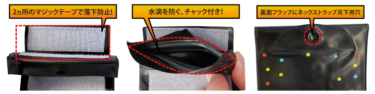 簡易防水機能のついたチケットホルダーです。チャックとマジックテープにより、通常の屋外での使用であれば、防水効果が得られます。